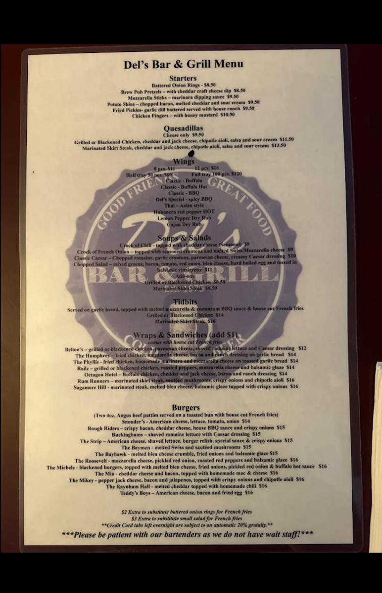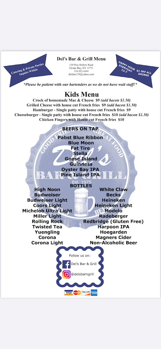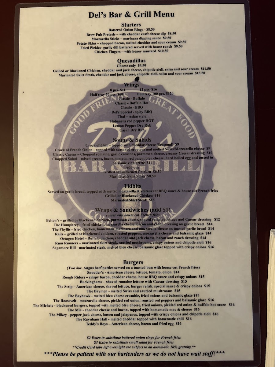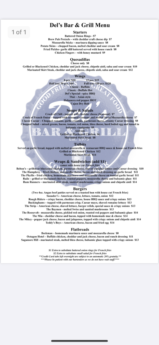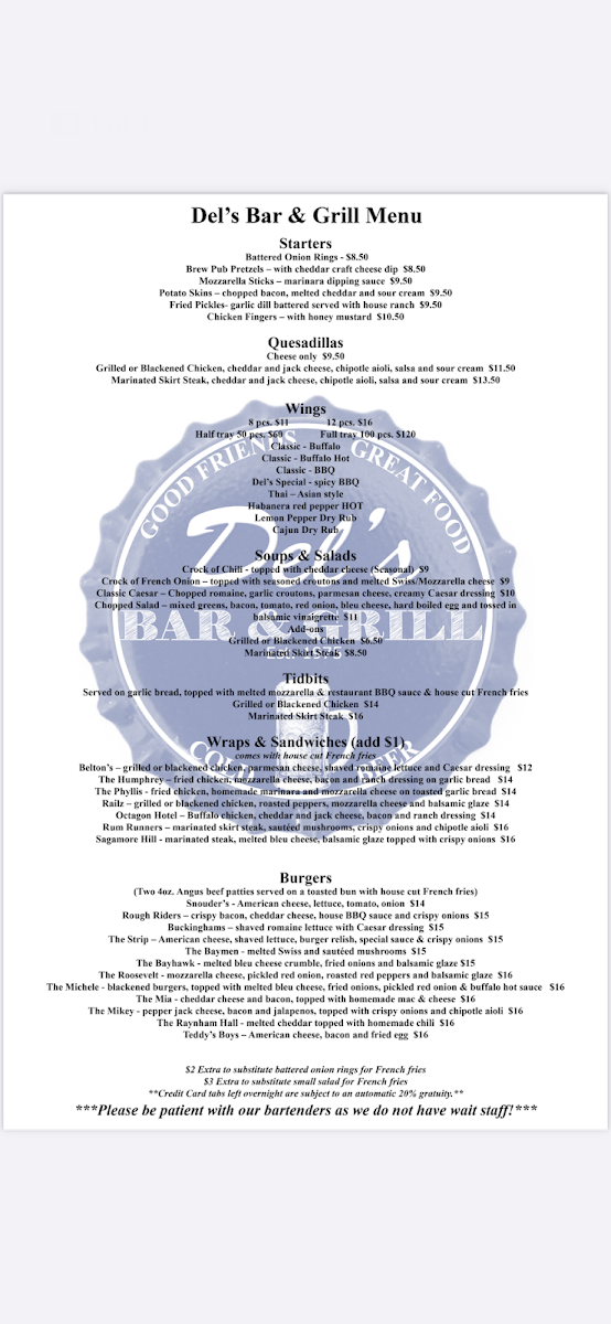 Del's Bar & Grill offers a menu centered around approachable, satisfying bar and grill classics that fit naturally into a relaxed, neighborhood setting. The food is designed for shared moments—whether catching up with friends over a cold beer during happy hour or settling in for a casual meal while watching the game.
